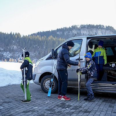 The playroom that inspires and impresses the children most is nature! And because it is always there we make the most of it and spend plenty of time there with the children: in the cave park we investigate the large cave, we build stone towers or carve bows and arrows. The edge of the Begenzer river is the perfect place to spend hot summer days, building damns and grilling on an open fire. In the playground or sports ground, we climb, play ball, jump and swing. When a bus journey to Bezau is on the plan it usually means something special is happening, we go for a ride with the ponies, lamas and goats from Pius!