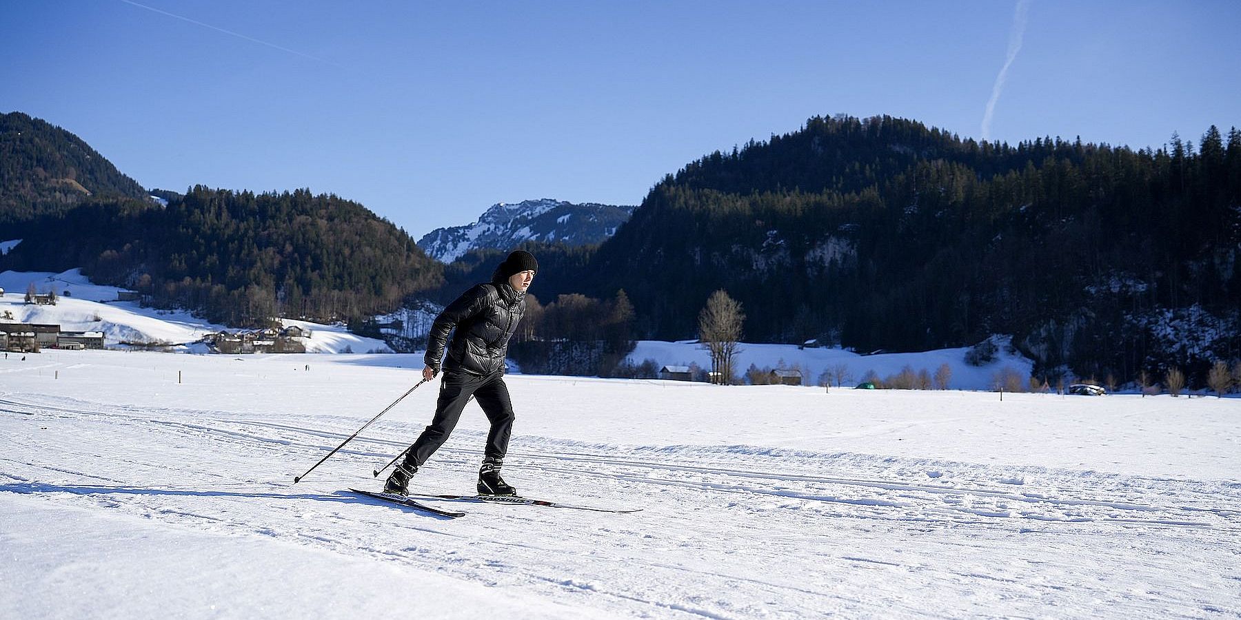 300 Kilometer Langlaufloipen werden jeden Winter im Bregenzerwald präpariert. Sie führen durch Flussauen, verschneite Wälder, über weite Wiesen, vorbei an Birkenhainen und den so typischen holzgeschindelten Häusern.