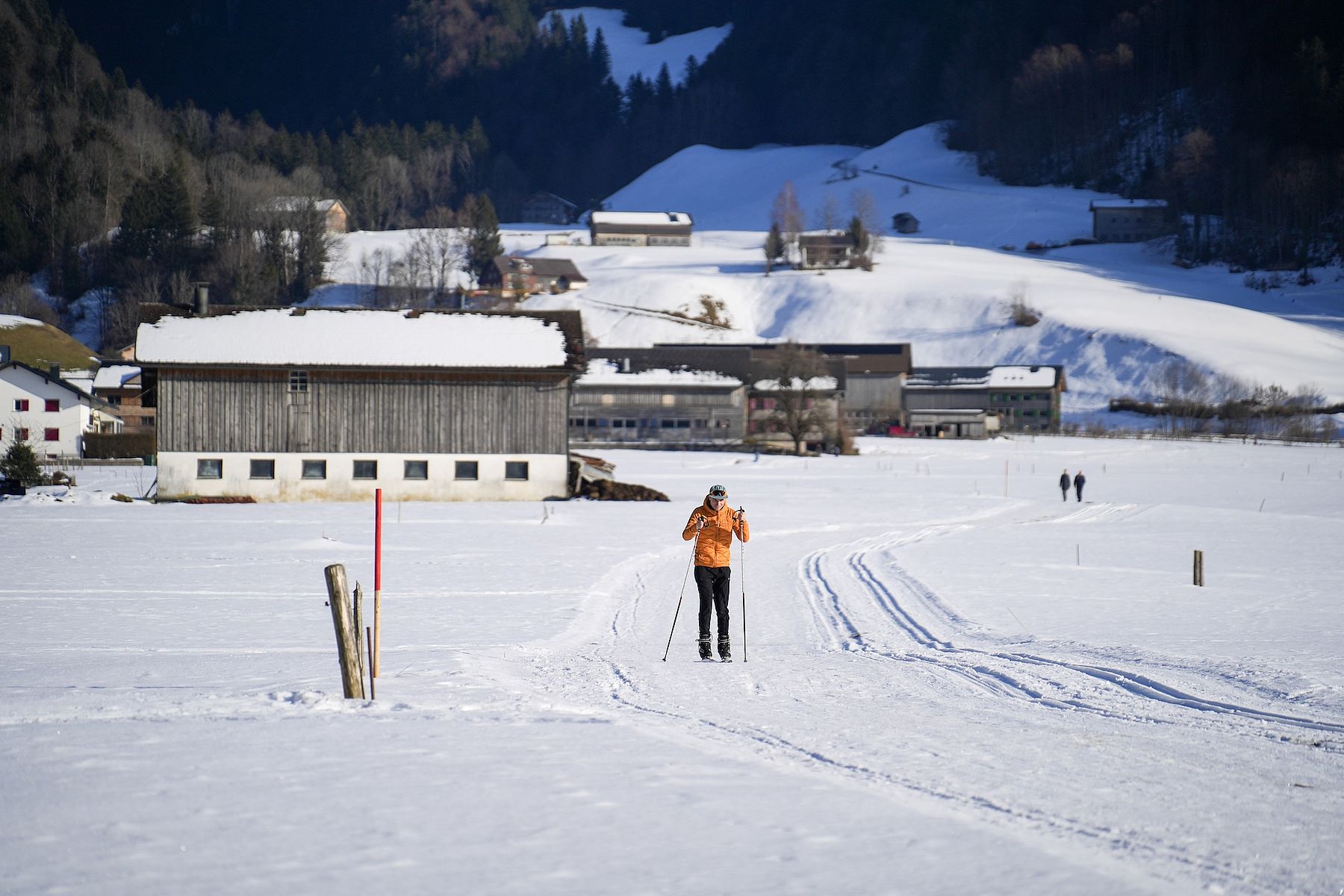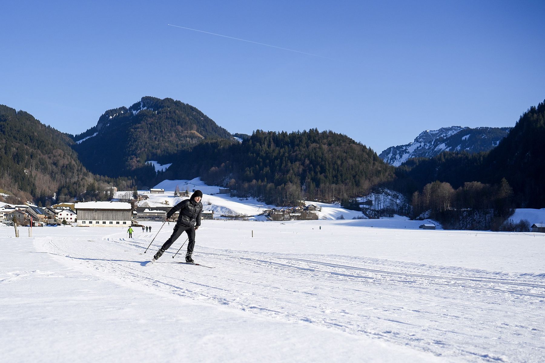 300 Kilometer Langlaufloipen werden jeden Winter im Bregenzerwald präpariert. Sie führen durch Flussauen, verschneite Wälder, über weite Wiesen, vorbei an Birkenhainen und den so typischen holzgeschindelten Häusern.
